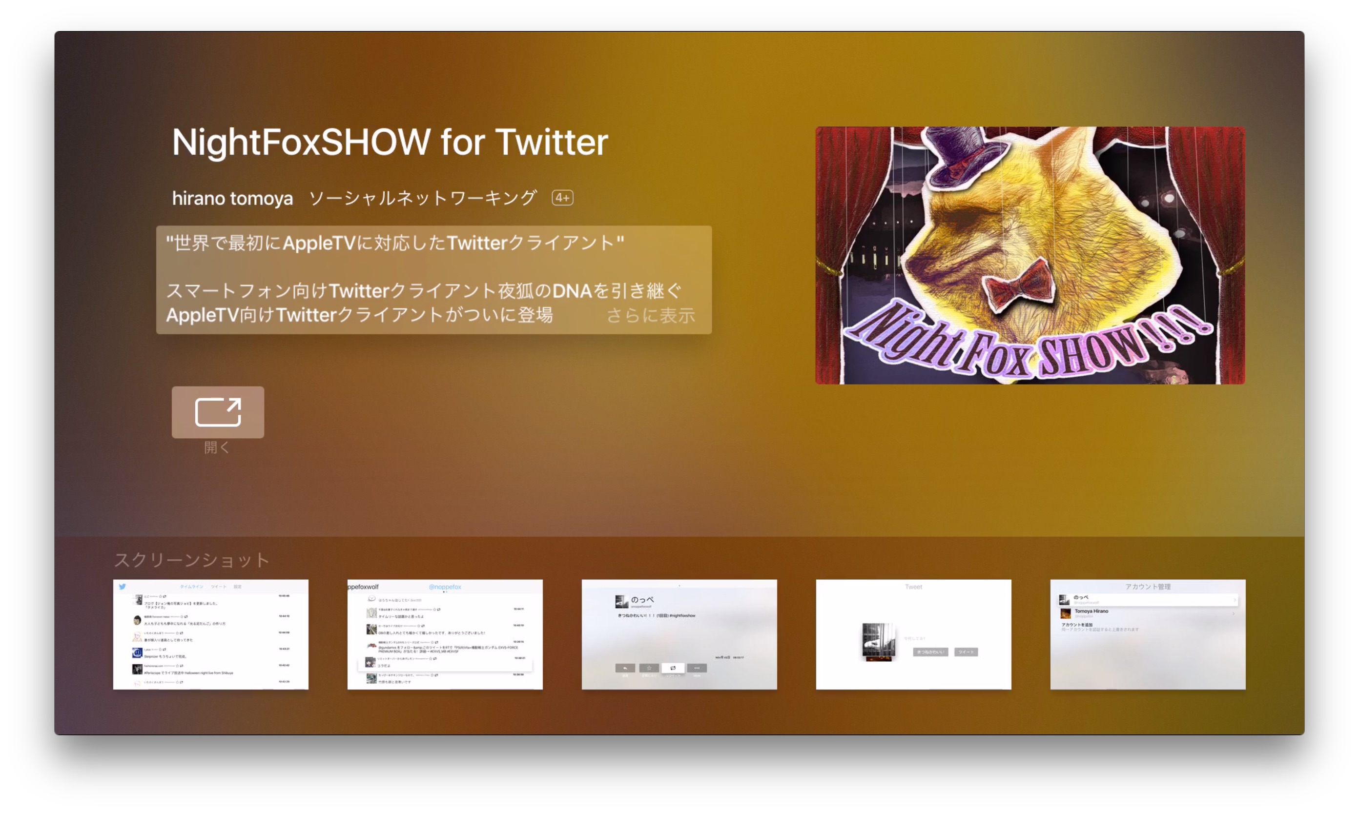 世界初のApple TV用Twitterクライアント「NightFoxSHOW for Twitter」がリリースされています。詳細は以下から。