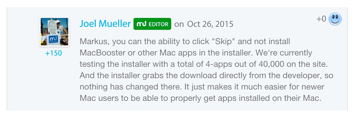 MacUpdateのインストーラーにアドウェアインストーラーが同梱されたニュースは、今週になり新たに米MacworldやEngadgetが報じており、これに対しMacUpdateのJoelさんは「現在、MacUpdateに登録されている約4万アプリ中の4アプリでこの新しいMacUpdate Installerをテスト中で、Skipを選択すればMacBoosterや他のアプリはインストールされない」と説明しており、