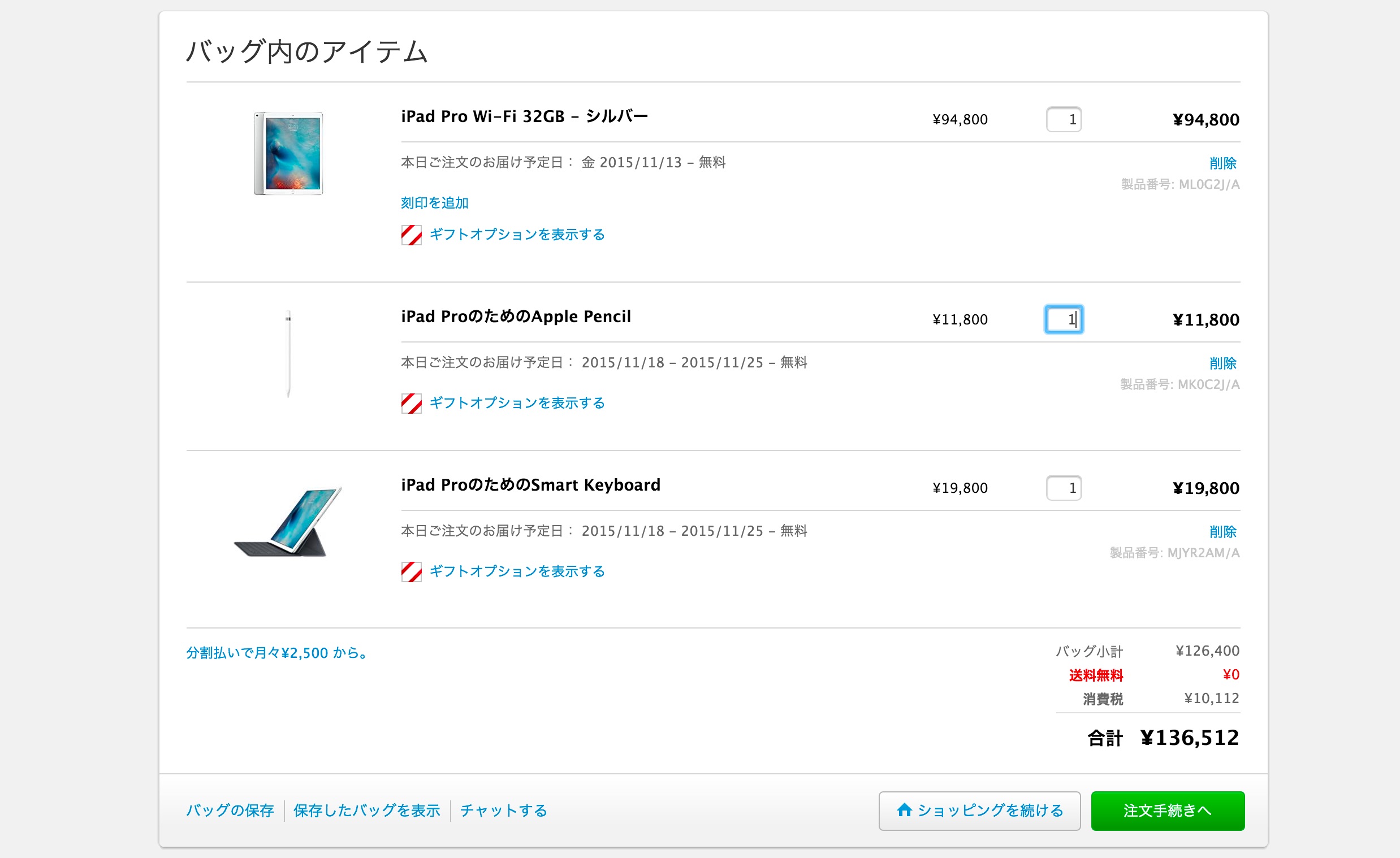 Appleが先日の発表通り、本日11月11日よりApple Online StoreでiPad Proおよびその他アクセサリーの販売を開始しています。現在のところお届け予定日は店頭販売が始まる11月13日となっており、アクセサリーは18日以降になるようです。