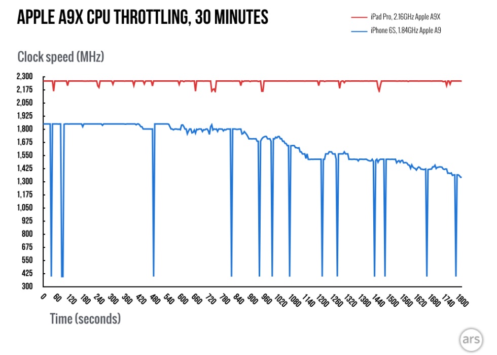 Ars TechnicaのシニアエディタAndrewさんは、iPad ProがiPhone 6sのA9@1.8GHzよりクロック周波数が高いA9X@2.2GHzであることに着目し、これほど高性能なCPUがCore Mの様にファンレスで長時間使用された場合のパフォーマンスの変化をGeekbenchを利用し測定、