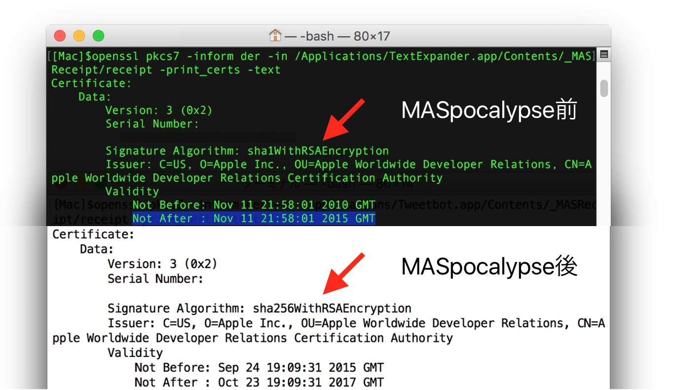 グリニッジ標準時 2015年11月11日に世界中のMacで一部のアプリが利用できなくなった問題[1, 2]は、開発者の間で「黙示(アポカリプス:Apocalypse)」を捩り「MASpocalypse」と呼ばれ始めていますが、この問題の原因は「AppleがMac App Storeの証明書にSHA-2を利用したからではないか?」とiMoreが報じています。