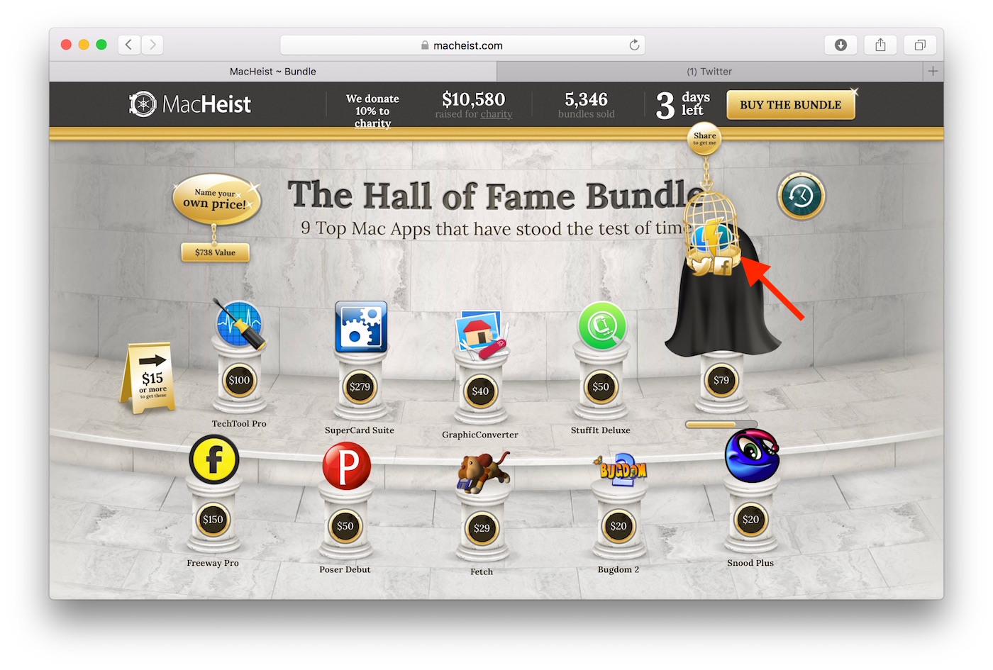 キャンペーンに参加するにはMacHeistのアカウントおよびTwitter/Facebookのアカウントが必要で、各アカウントにログインしたらMacHeistのトップページ「Share」下にある鳥かごをクリック。