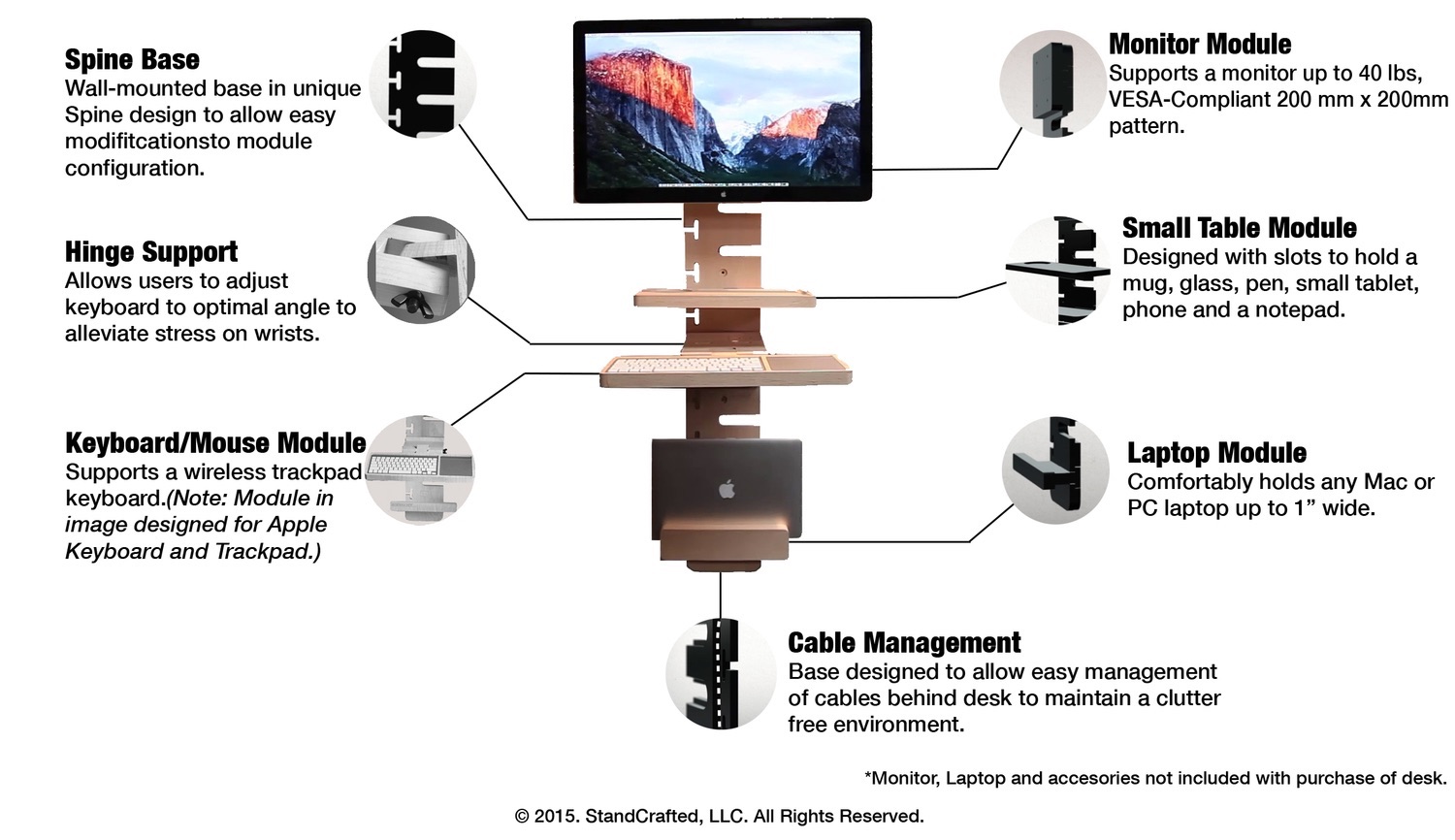 本体はMonitor, Table, Keyboard/Trackpad/Mouse, Laptopを設置できる4つのモジュールから構成されており、各モジュールはメインフレームの溝の位置に合わせて自由に調整することが可能で、背面にはケーブルなどを通せるスペースが有り、MonitorモジュールからLaptopモジュールまで電源やHDMIケーブルをデザインを損なうこと無く接続できるようになっています。