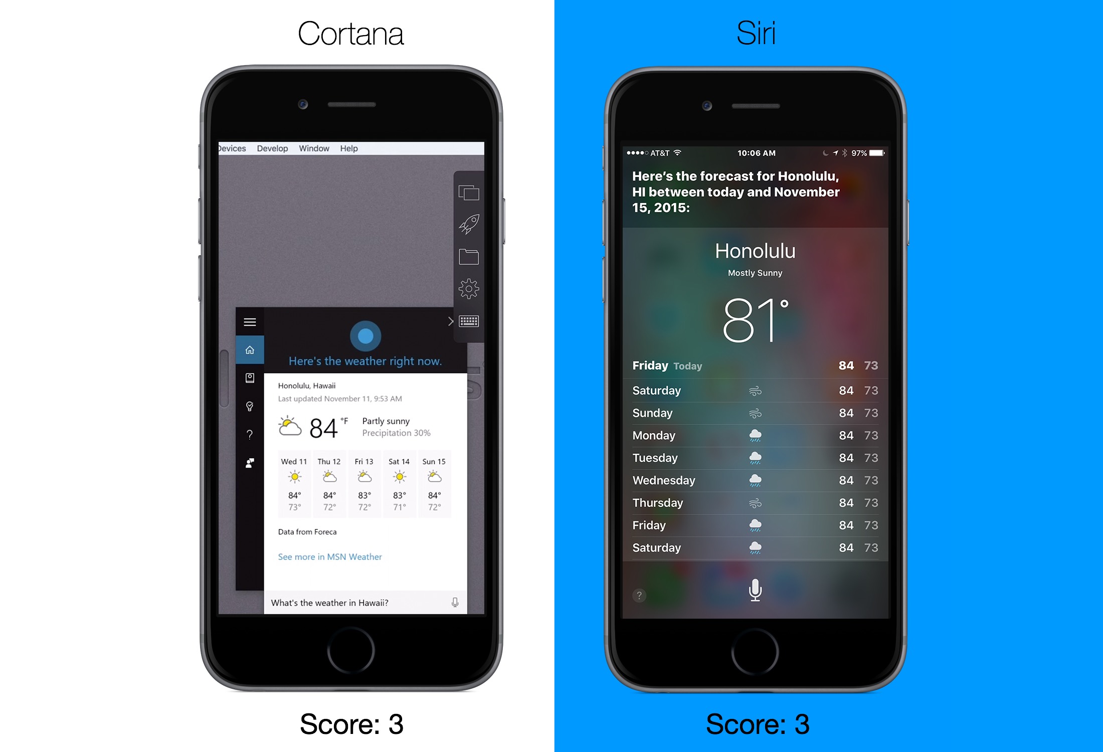 CortanaはMacBook Retina ProのParallels Desktop上でWindows 10を動かし、Parallels Access経由でiPhone上に表示、両音声アシスタントに「今のハワイの天気は?」「朝食は日本語でなんて言うの?」などといった20の質問をし、回答を0~4の5段階で評価。結果は以下の通りで、Siriが僅差で勝利する形となっています。