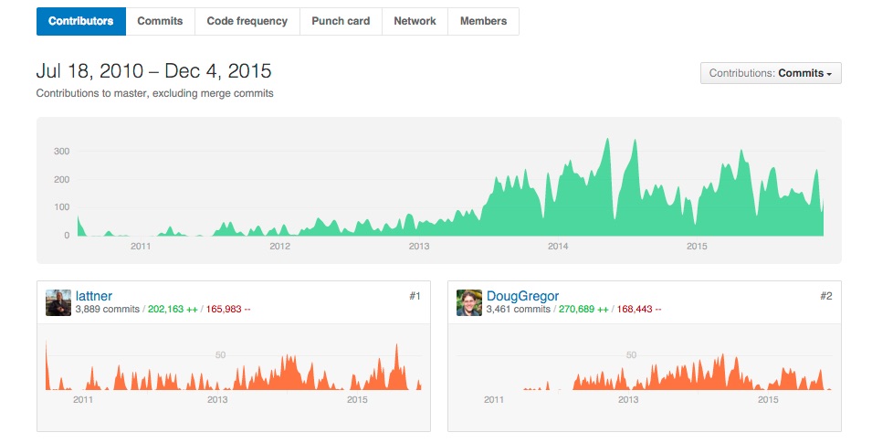 Swiftの開発ログも全て公開(*1)されているようで、GitHubのリポジトリではLLVMやSwiftの生みの親で、現在もAppleのプロジェクトディレクターとして働いているChris Lattner(Twitter)氏のコントリビュートを2010年07月から見ることが出来ます。