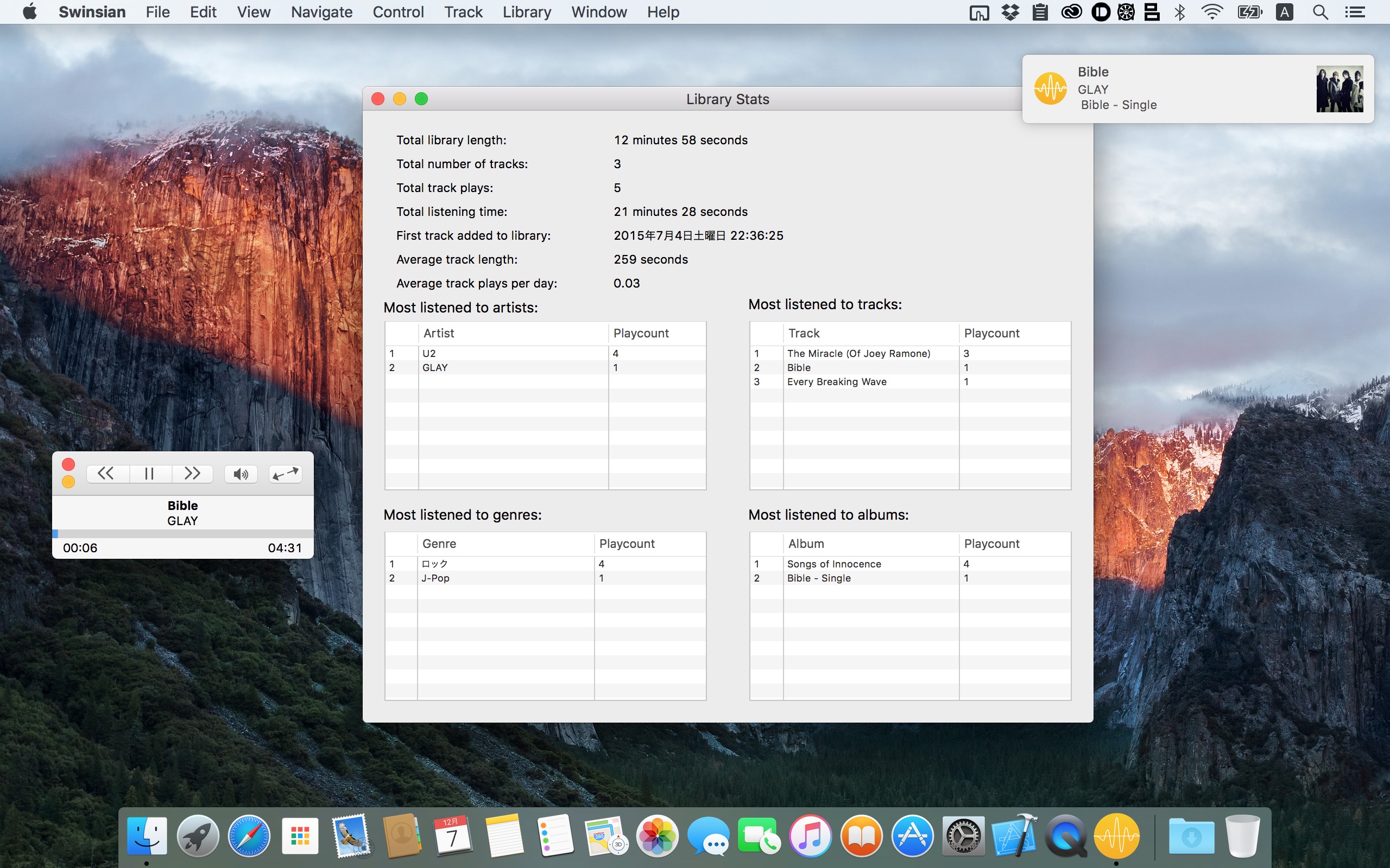 その他Swinsianにはライブラリ全体の曲数やプレイリストの状況を確認できる「Library Stats」、ミニプレイヤー機能、通知センターでの通知機能など様々な機能が備わっています。