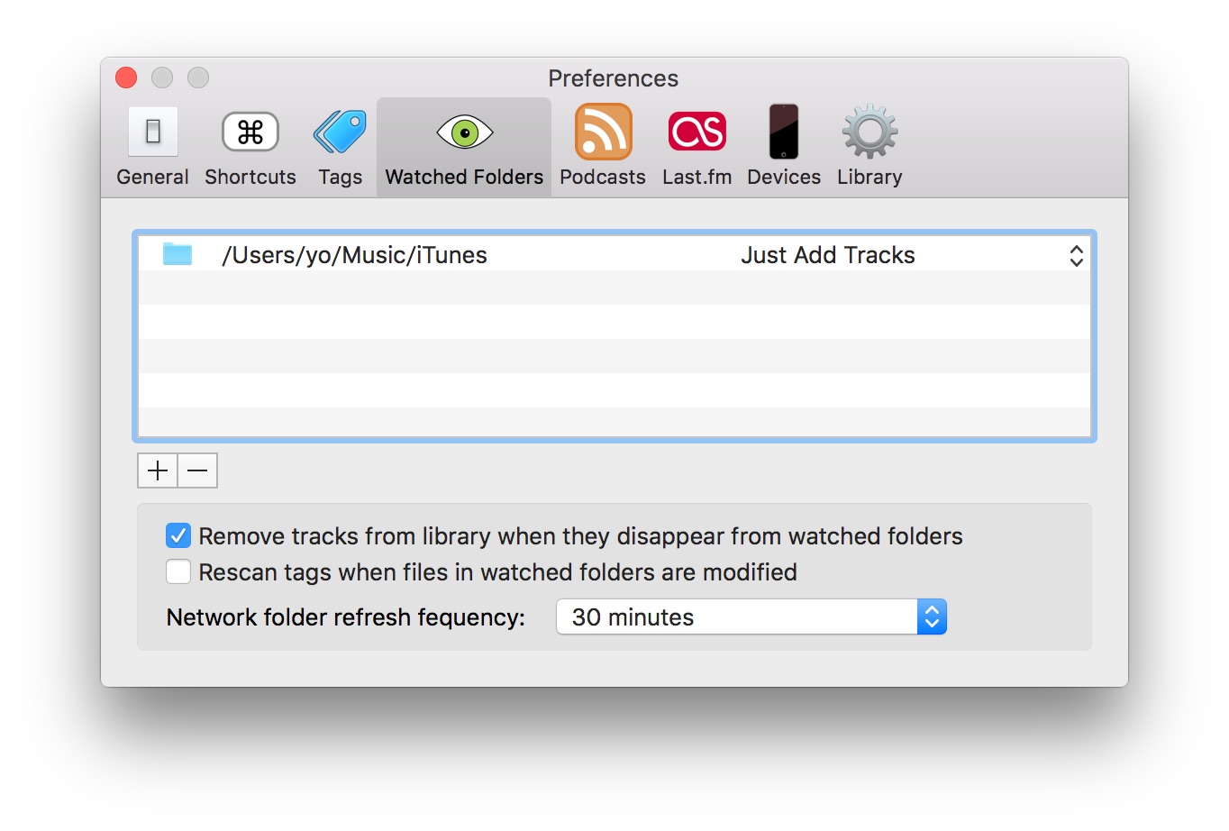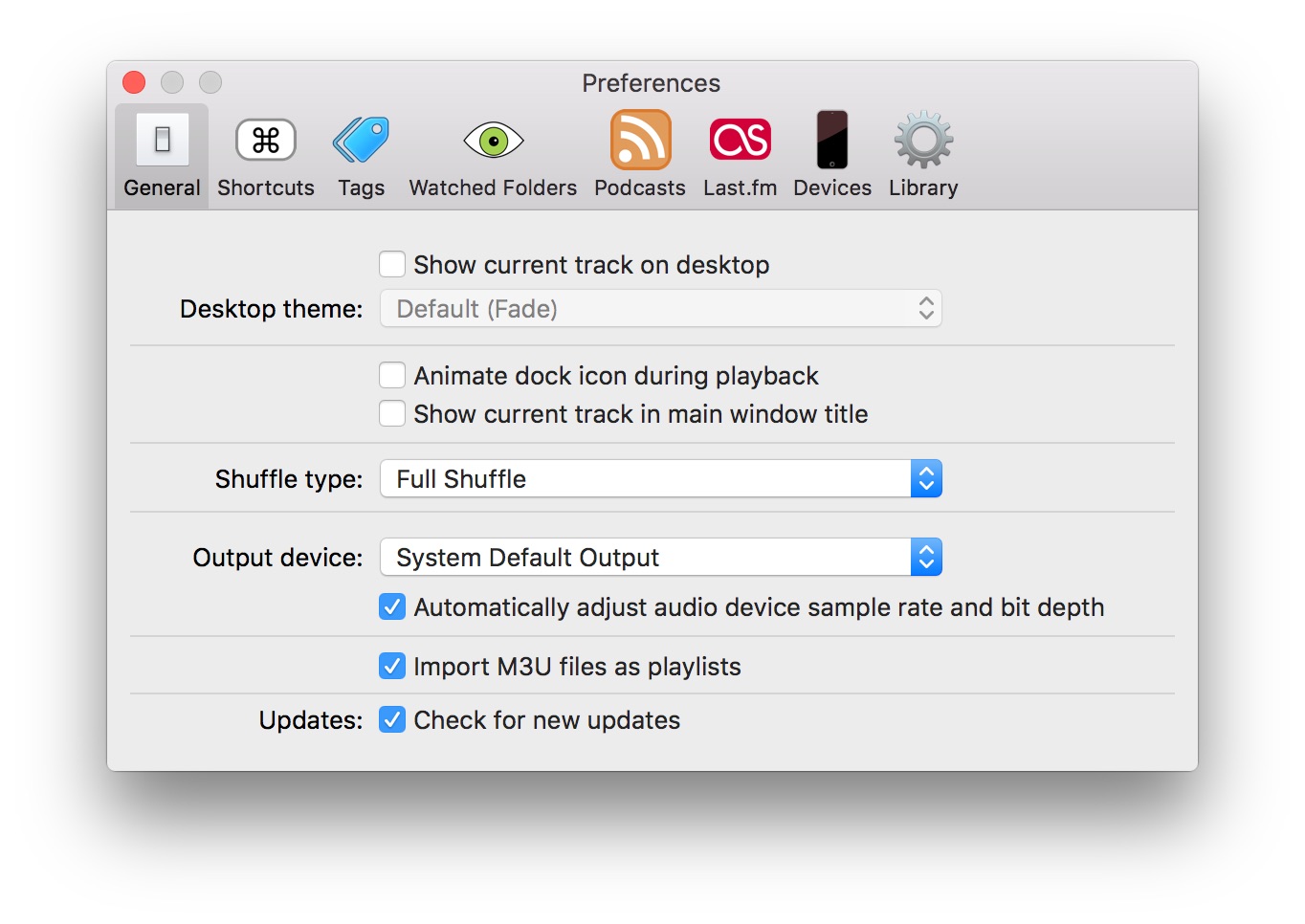 Preferencesからは「一般」「ショートカットキー」「タグ」「フォルダ監視」「ポッドキャスト」「Last.fm」「iOSデバイス」「ライブラリ」の設定が可能で、フォルダ監視機能は指定フォルダから手動で曲が削除された場合、Swinsianのプレイリストからその曲を削除してくれる機能などが利用できます。