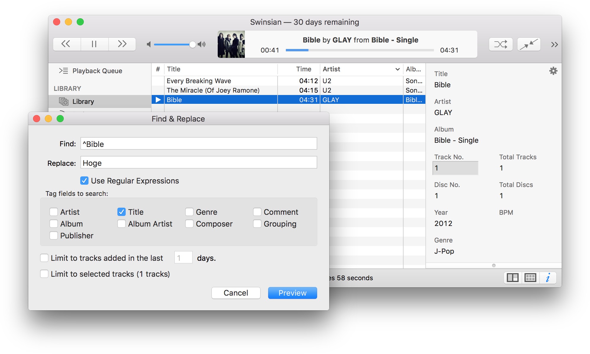 SwinsianにはID3タグエディタやスマートプレイリストの他、iTunesには無い正規表現や強力な重複ファイル検出機能なども備わっています。