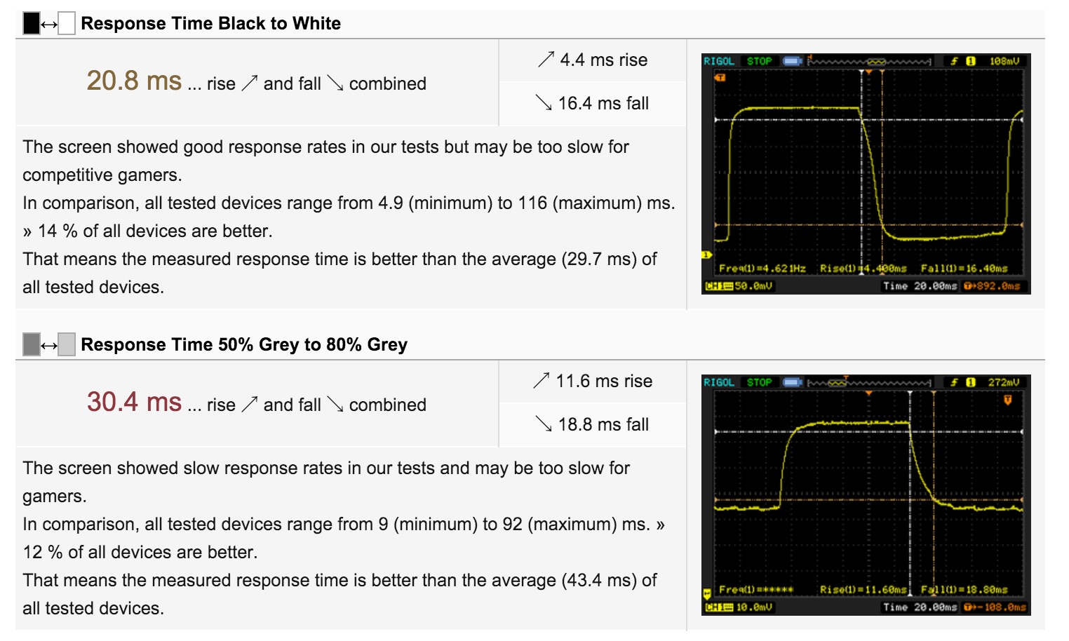 The color accuracy (tested compared to the advertised DCI-3P color space) reveals a similar DeltaE deviation (2.8) compared to the iMac Retina 2014 (2.66), but the grayscale performance is much better at 1.96 (iMac Retina 2014: 3.47). These values drop to below 0.5 after calibration. The sRGB color space is covered almost completely at 99.7%, while the AdobeRGB coverage of the iMac is 79%. […]The screen showed good response rates in our tests but may be too slow for competitive gamers.