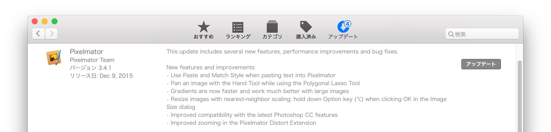 Pixelmator for Mac v3.4.1はv3.4からのマイナーアップデートで、リリース・ノートによるとPhotoshop CCとの互換性やズーム機能の改善など不具合修正が中心ですが、