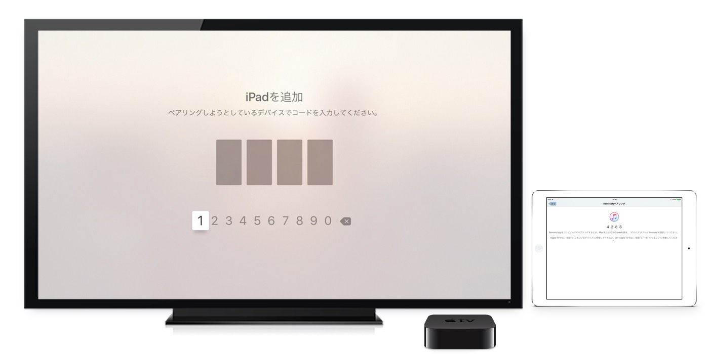 使い方はまず、iPadにインストールしたRemoteアプリをApple TV (第4世代)とをペアリングします。ペアリング方法はRemoteアプリを起動し、Apple TV (第4世代)の設定から[設定] > [リモコンとデバイス] > [Remote App]へ移動し、ペアリングコードを入力。