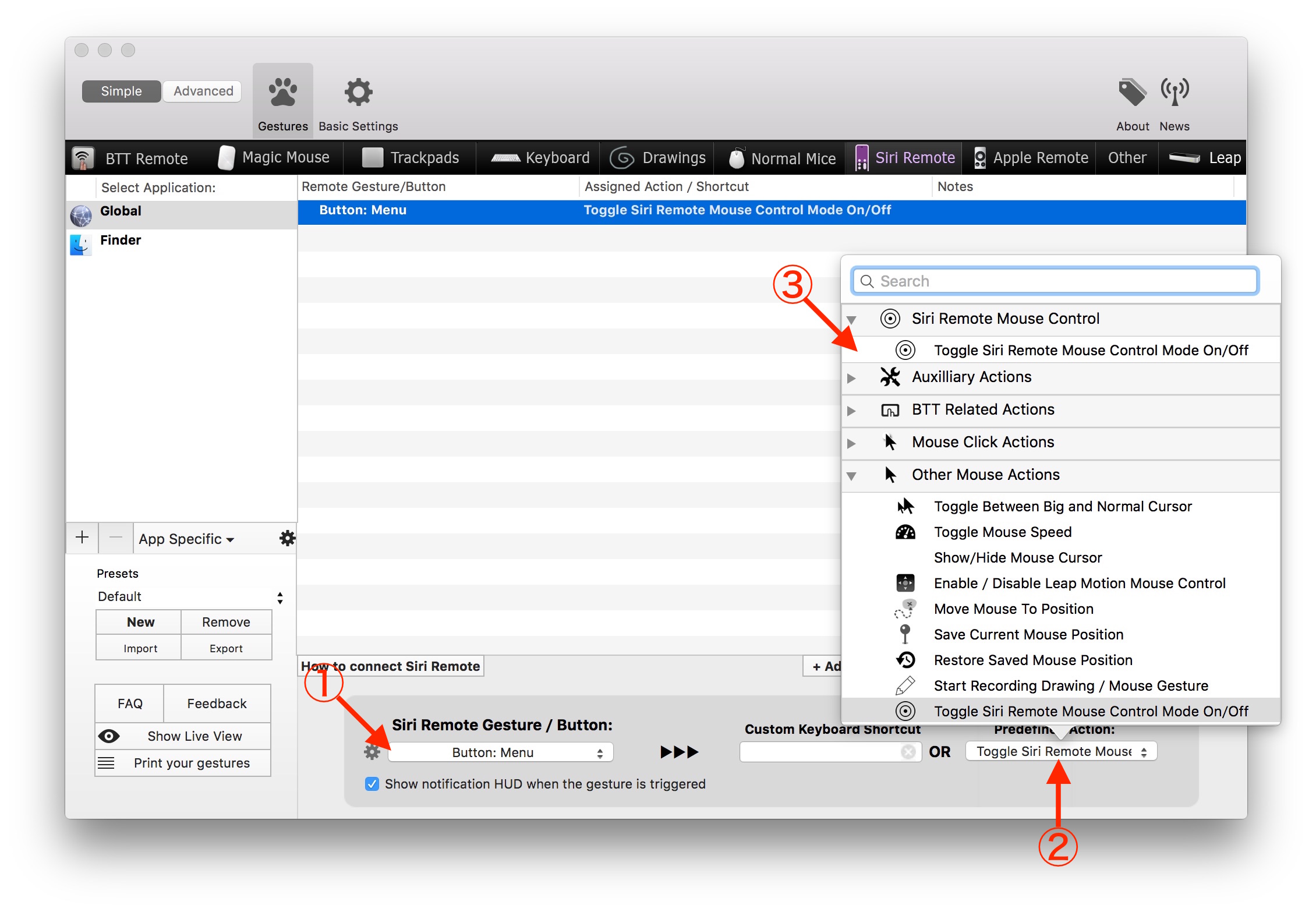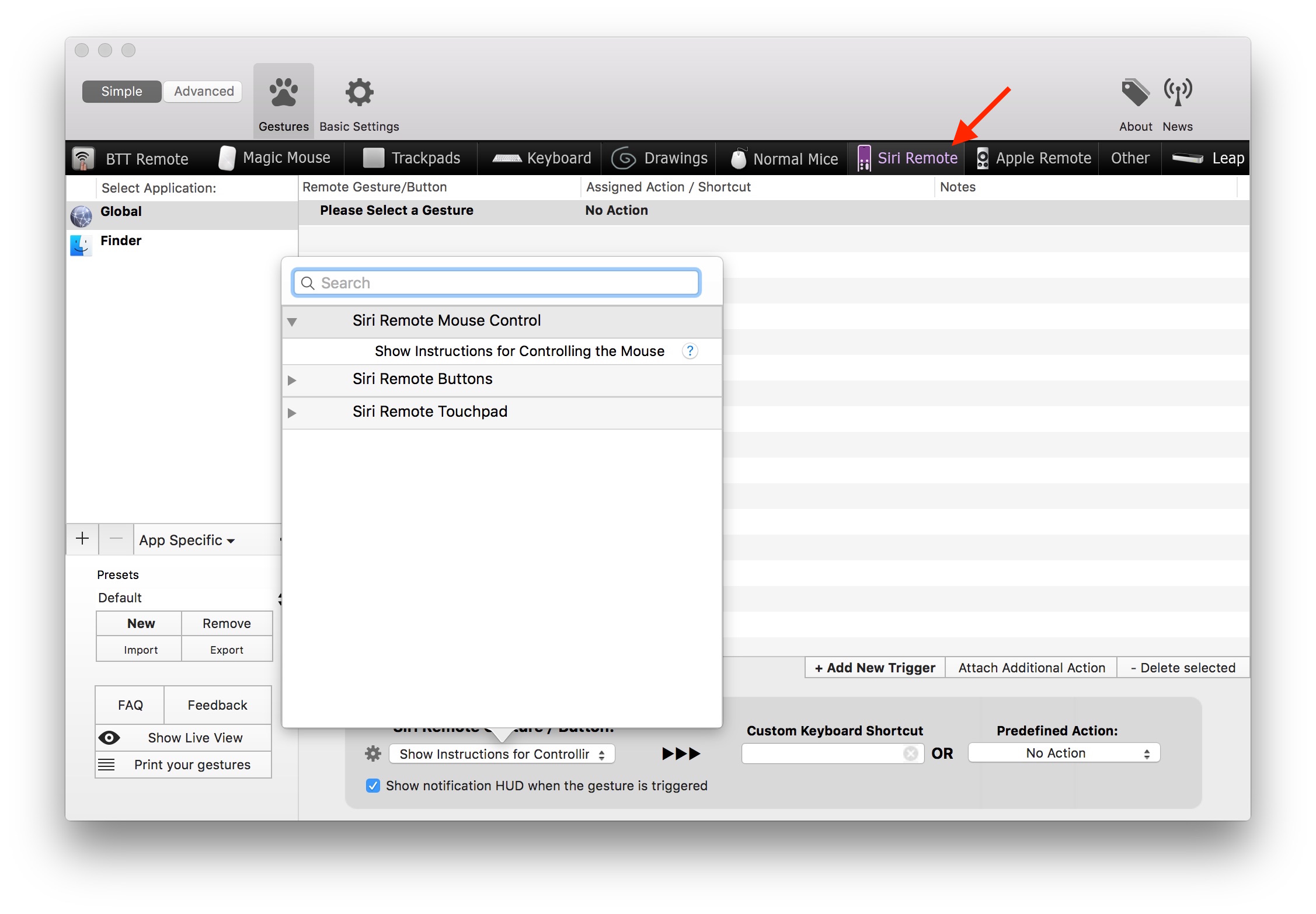 次にBetterTouchToolsをアルファ版にアップデートし、起動。Siri Remoteタブから「Siri Remote Gesture / Button」セレクトウィンドウに移動し、