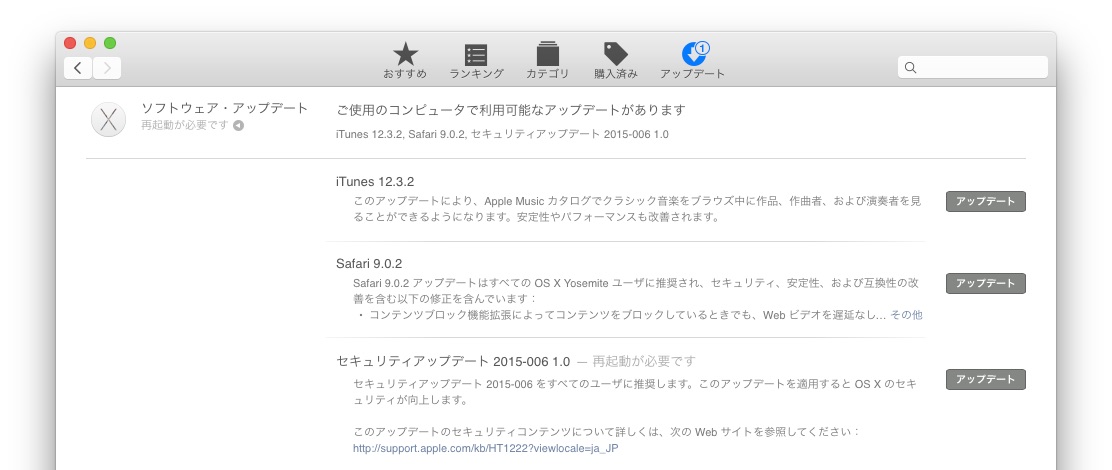 セキュリティアップデート 2015-006 をすべてのユーザに推奨します。このアップデートを適用すると OS X のセキュリティが向上します。