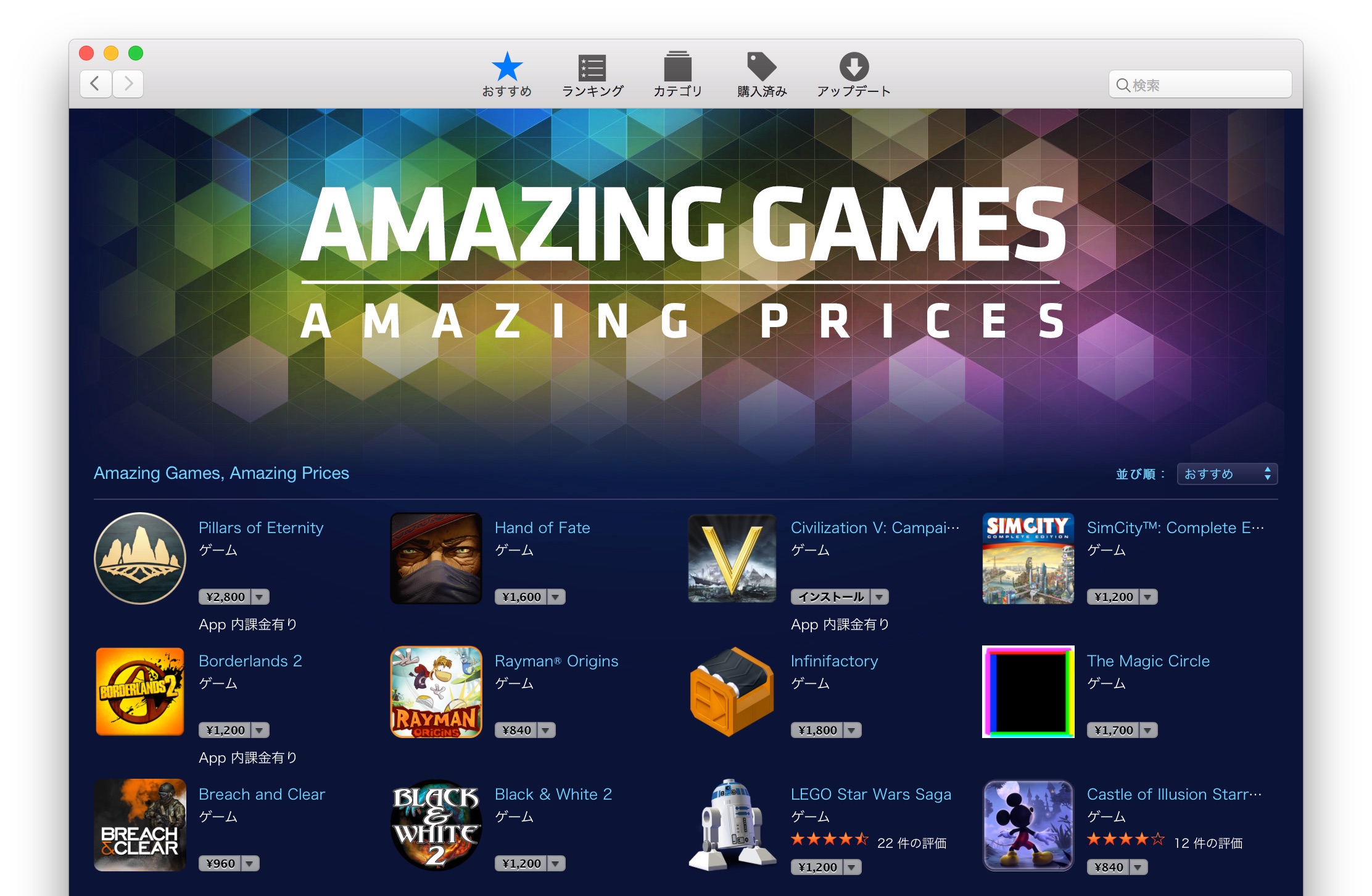 昨日から複数のゲームアプリがMac App Storeで一斉にセールを始めていましたが、本日AppleがMac App Storeでスター・ウォーズやSimCityなど有名タイトル36作品を最大75%OFFで販売する「Amazing Games Amazing Prices」を始めたようです。