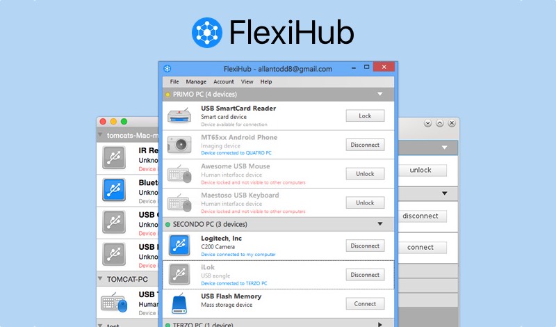 FlexiHubはPCやMacに接続されているキーボードやマウス、プリンター、WebカメラなどのUSBデバイスをインターネットやローカルネットワーク経由で共有するUSB over Networkサービスで、今回Mac版クライアントがリリースされたことで、Windows, Mac, LinuxプラットフォームでのUSBデバイスの共有が可能になったそうです。