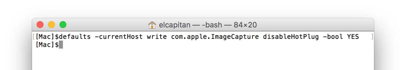 $defaults -currentHost write com.apple.ImageCapture disableHotPlug -bool YES