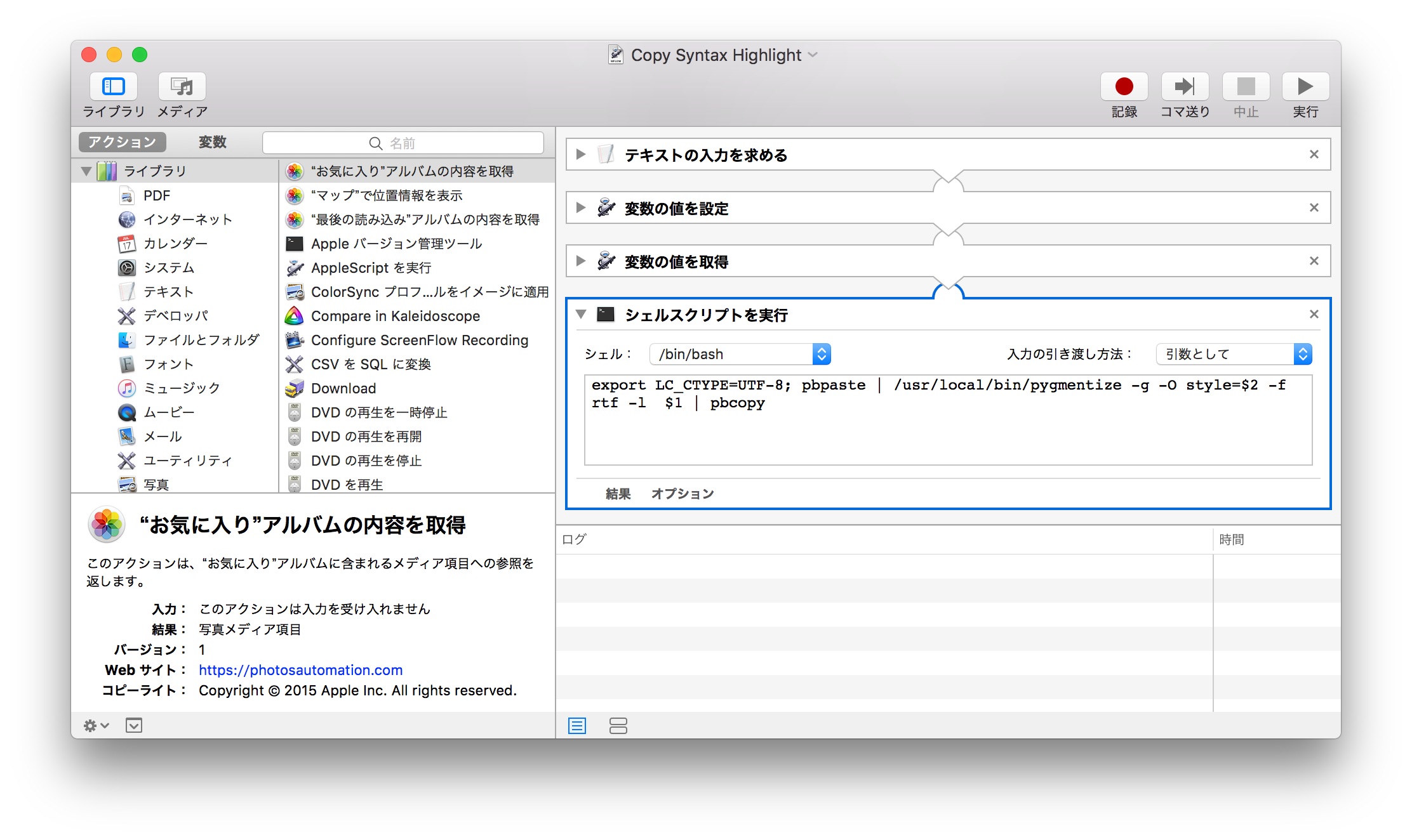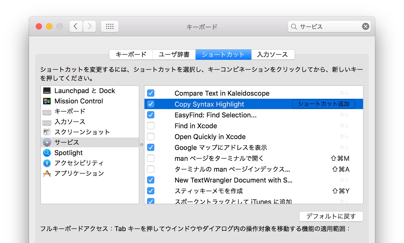 後は、WoolfさんのGitHubからCopy Syntax Highlight for OS Xをダウンロードし、「Copy Syntax Highlight.workflow」をダブルクリックすればOS Xのサービスに「Copy Syntax Highlight」が追加されるので、コンテクストメニューから利用できるようになります。