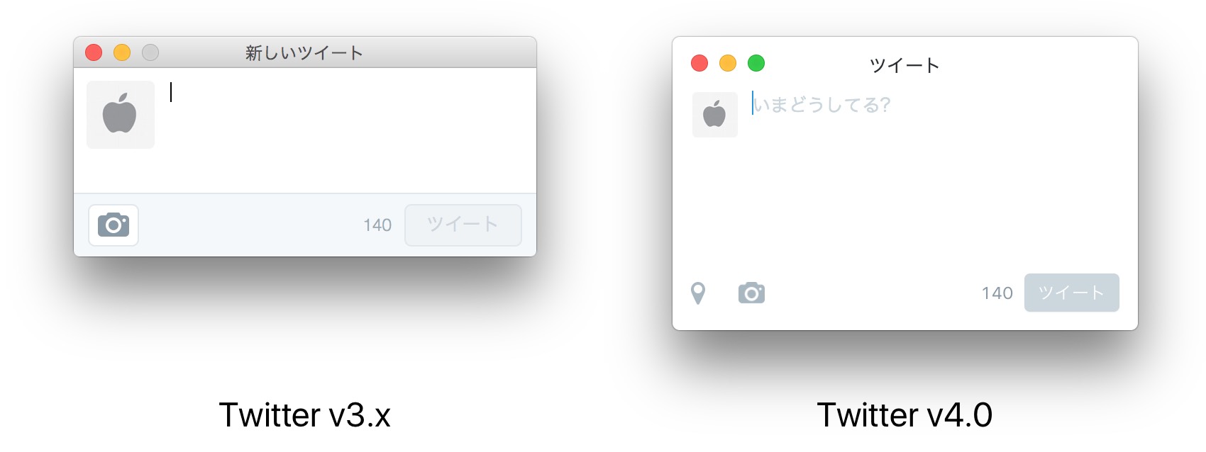 Twitter v4.0ではアイコンが刷新され、WWDC 2014の「Adapting Your App to the New UI of OS X Yosemite」の通りAppleのガイドラインに準拠した丸いアイコンが採用されています。