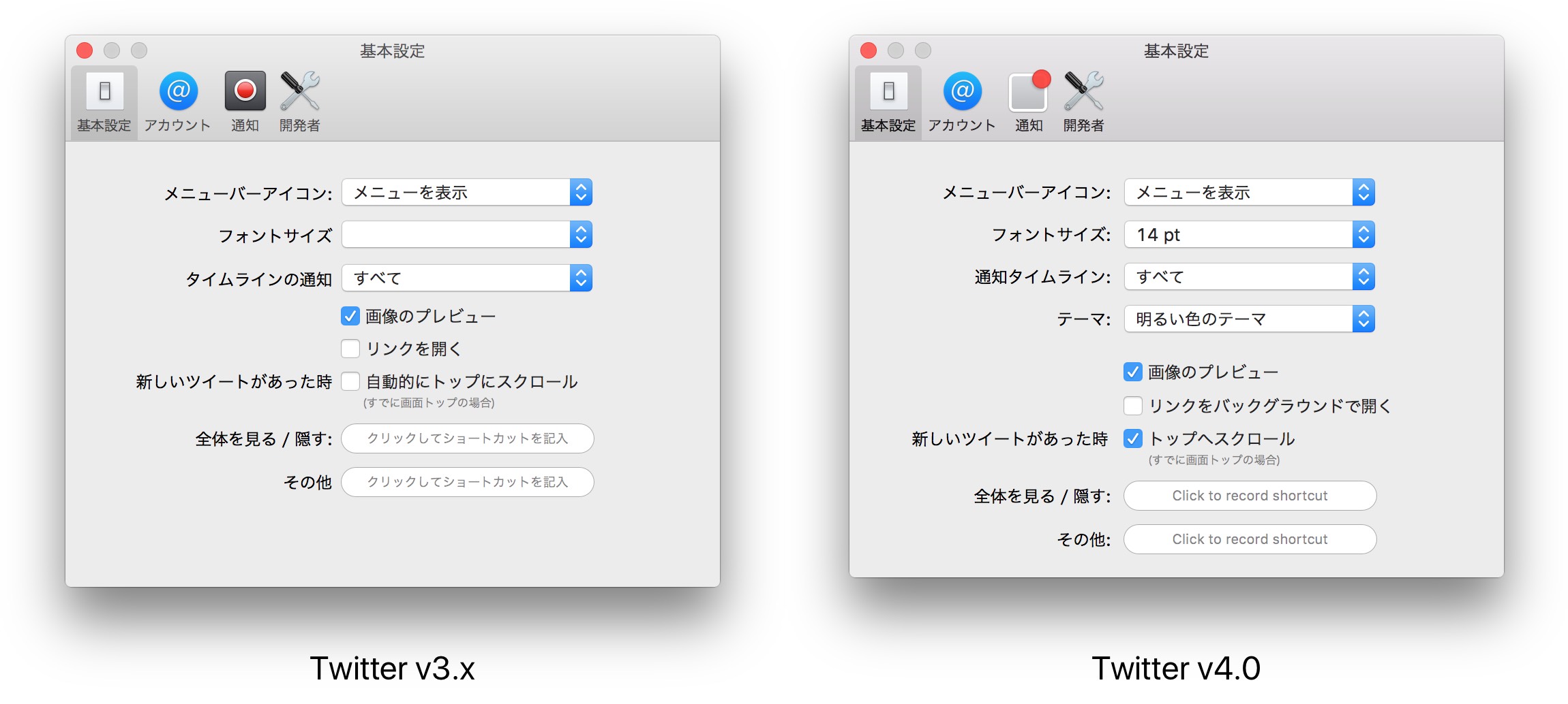 設定ウィンドウは特に大きな変化はありませんが、Twitter v4.0の新機能であるテーマ変更の設定や通知センターウィジェットに表示するアカウントの切替機能が追加されています。