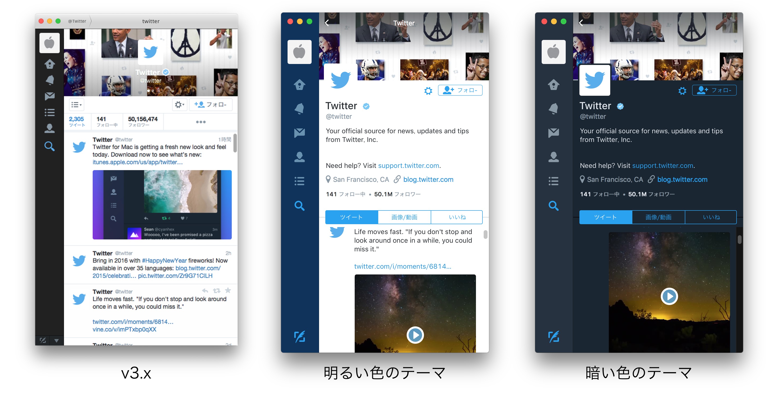 v4.0からはYosemiteやEl Capitanに合わせBlurが採用され、「明るい色のテーマ」と「暗い色のテーマ」がTwitterアプリの基本設定から選択できるようになっています。