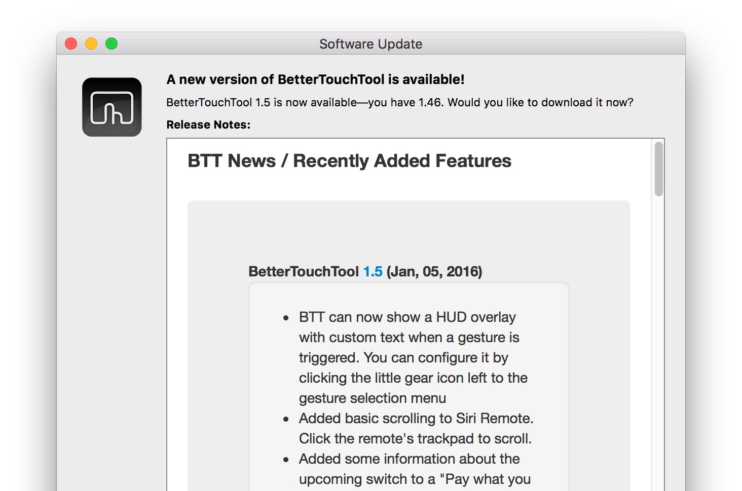 BetterTouchTool(以下BTT)はMagic TrackpadやMouseなどにシステム設定以上のジェスチャーや機能を設定できるMac用ユーティリティアプリですが、このBTTがv1.5へアップデートすると共に、開発者のAndreasさんが昨年末にブログに公開していた通りBTTを「あなたが払いたいだけの金額を払うPWYWモデルへ移行する」と発表しています。