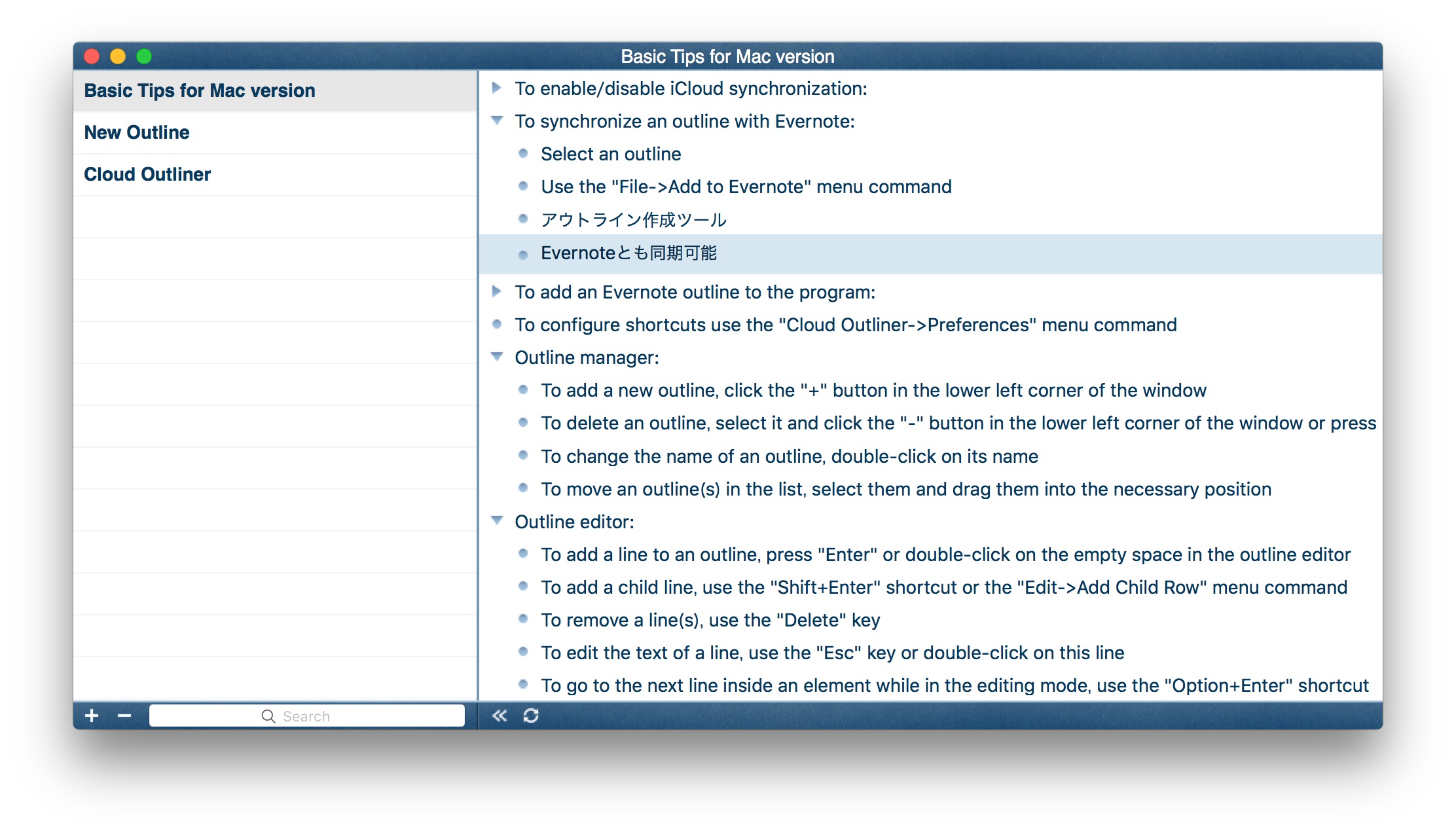 Cloud OutlinerはXWaveSoftが開発しているMac/iOSデバイスをサポートしたアウトライン作成ツールで、iCloudの他にEvernoteともデータを同期し共有することが可能です。
