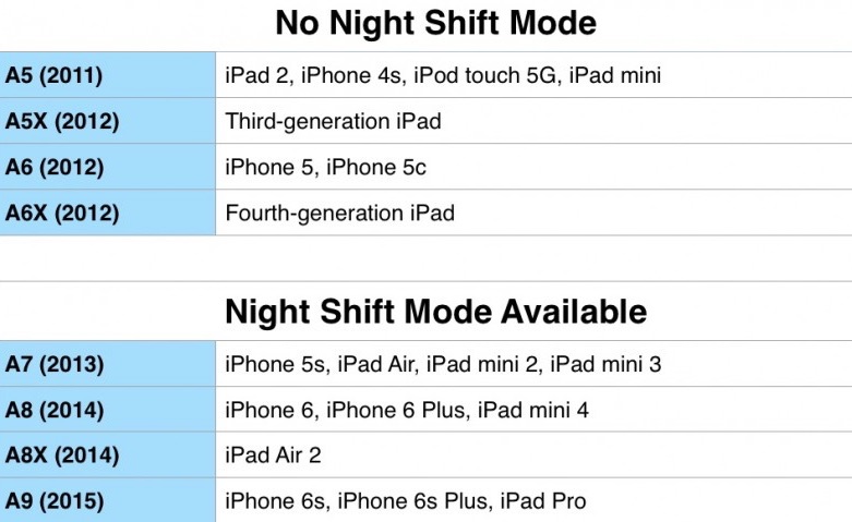 ブルーライトを軽減するiOS 9.3の新機能「Night Shift」はiPhone 5や5cに搭載されているApple A6など非64bitのプロセッサでは動作しないそうです。詳細は以下から。