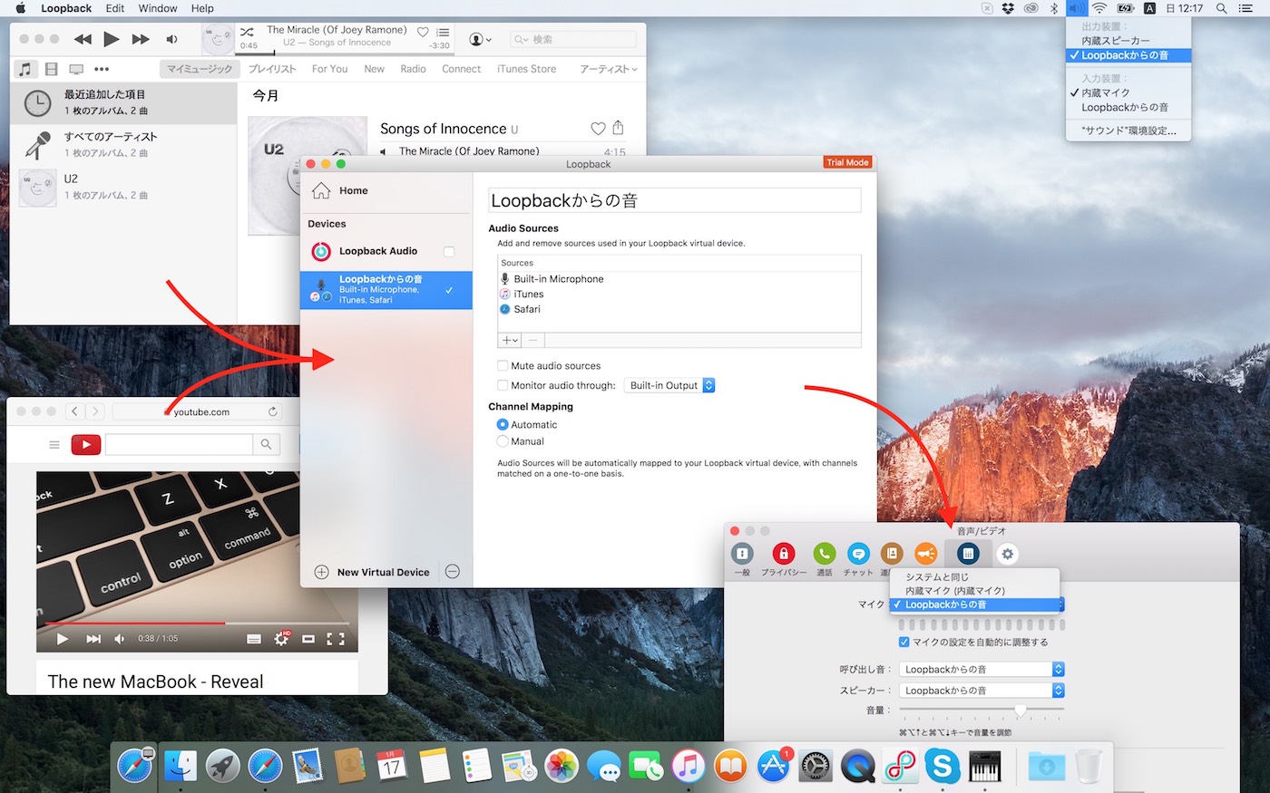 以上でLoopbackの設定は完了で、後は各アプリやシステムのオーディオ設定で「Loopackからの音」を選択してやればマイクとiTunes, Safariの音を同時にSkypeなどで配信できます。