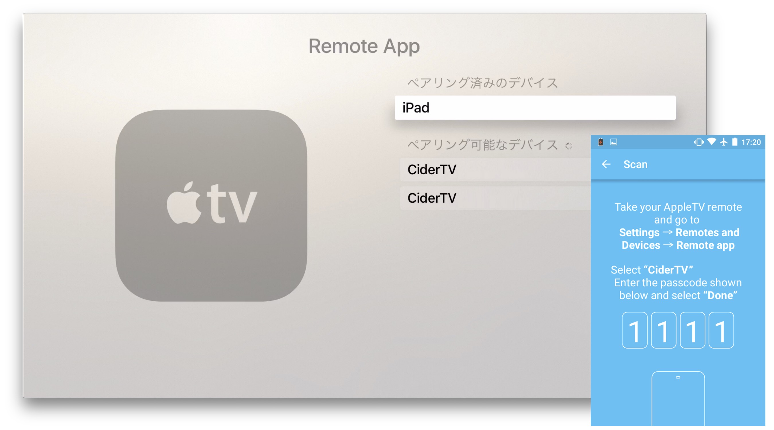 CiderTVはAIR Remoteと同様にRemoteアプリをエミュレートしており、同一Wi-Fi内にあるApple TVの設定アプリから[リモコンとデバイス] > [Remote App]でペアリングしてやることで、iOSやAndroidデバイスをRemoteアプリの様に利用できます。