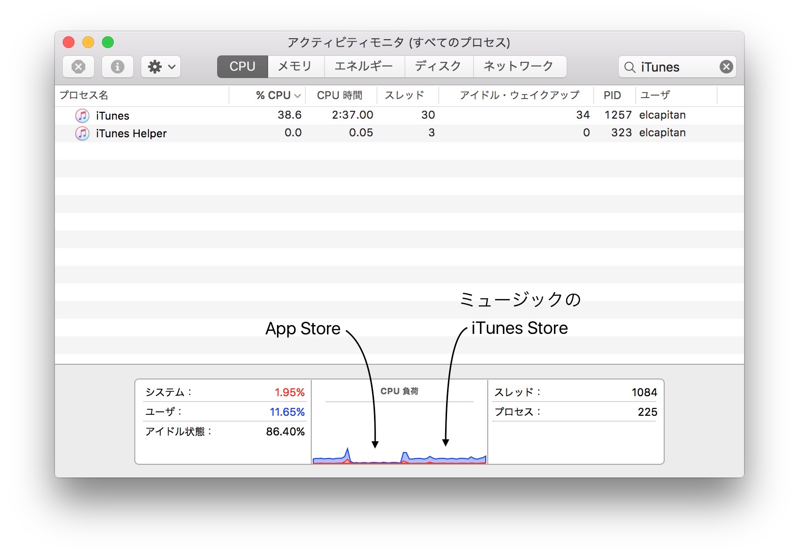 iTunesアプリで[ミュージック] > [iTunes Store] のトップページを開くと、他のページと違いCPU使用率が30~40%まで上がってしまう不具合がOS X 10.11.2の「iTunes 12.3.2」で確認されていましたが、