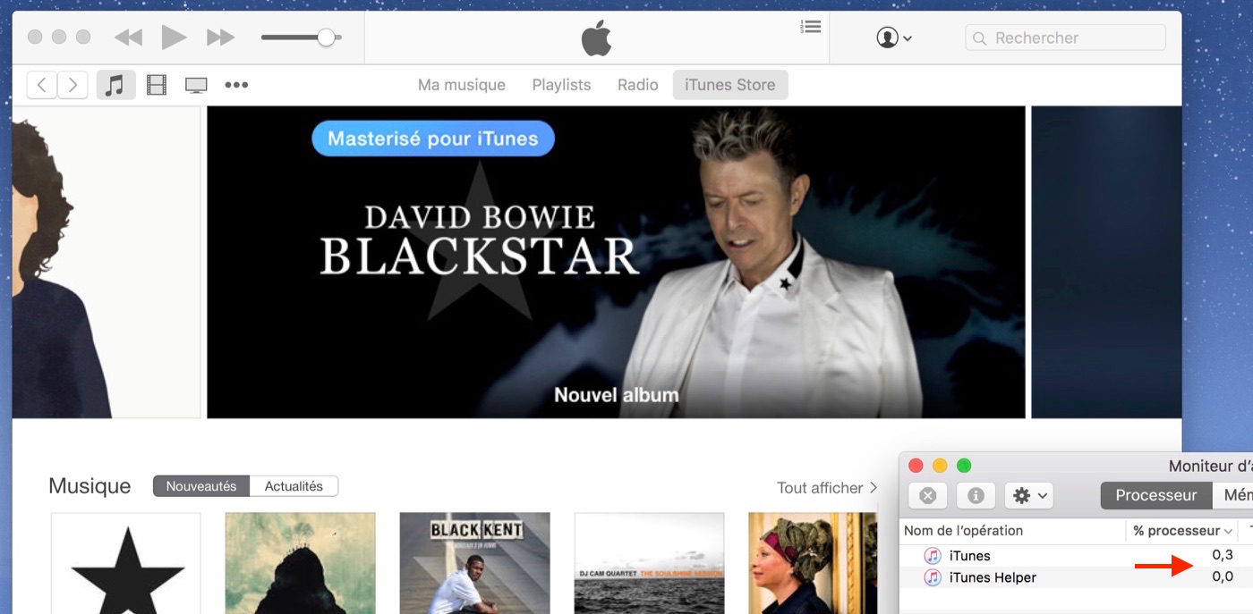 As you can see, with a carousel visible in the iTunes Store, and iTunes in the background, Activity Monitor shows a mere 0.3% activity for iTunes, and none at all for iTunes Helper. This is good news, since this background activity can be a big hit on your battery if you use a laptop.