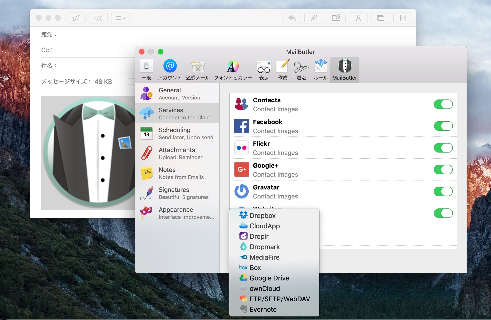 MailButlerのクラウド連携機能はAppleのiCloud以外のクラウドサービスに添付ファイルをアップロードすることが出来る機能で、Dropbox, CloudApp, Droplr, Dropmark, MediaFire, Box, Google Drive, ownCloud, FTP/SFTP/WebDAV, Evernoteのサービスと連携できます。