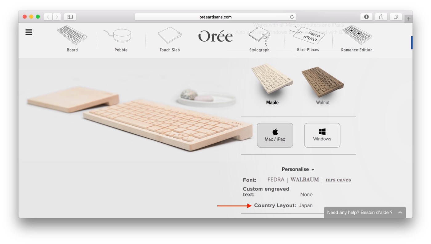 キーボードレイアウトはMac&iPadまたはWindows版が用意されており、個別受注生産のためキートップのフォントはFEDRA, WALBAUM, mrs eavesから、キーレイアウトは日本語を含めた15ヶ国から選択できるようになっています。