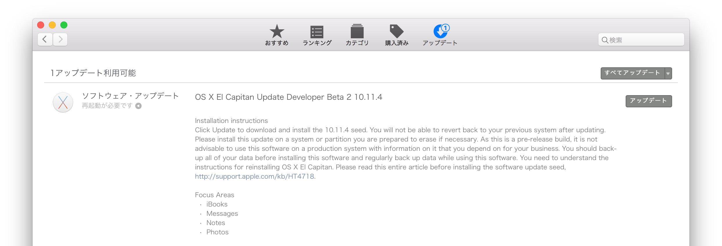 Appleは現地時間1月25日、OS X 10.11 El Capitan 4度目のアップデートとなるOS X 10.11.4の2nd Betaを開発者向けに公開しています。Build Numberは15E33eで、今回から新たにiBooks, メッセージ、メモ、写真アプリがフォーカスエリアに追加されています