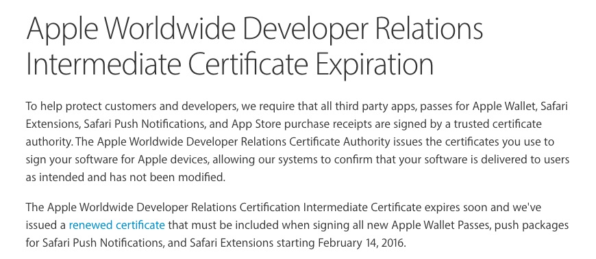 The Apple Worldwide Developer Relations Certification Intermediate Certificate expires soon and we’ve issued a renewed certificate that must be included when signing all new Apple Wallet Passes, push packages for Safari Push Notifications, and Safari Extensions starting February 14, 2016.
