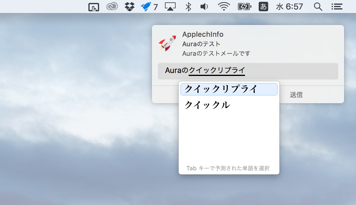 AuraはGmailの新着通知をMacの通知センターに表示してくれるアプリで、今回のアップデートでは日本語を含めた4言語のローカライズが施された他、新たに「クイックリプライ機能」が追加されています。