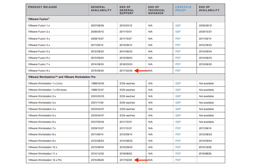VMware FusionおよびWorkstationの米開発チームが一時解雇されているのは確かのようですが、プロダクトが直ぐに無くなることはなく、Fusion 8およびWorkstation 12は2017年2月25日までのサポートが約束(*PDF)されています。