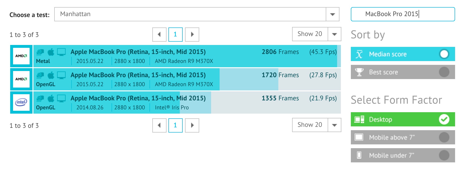今回比較ベンチマークに利用したのは「マンハッタン」と「ティラノサウルス レックス」のオンスクリーンテストで、OSはOS X 10.11.3, GPUはIntel Iris Graphics 6100を搭載したMacBook Pro (Retina, 13-inch, Early 2015)のエントリーモデルを使用。