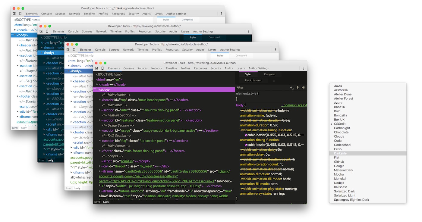 デベロッパーツールを再度起動すると先ほどのカラーテーマが適用されます。テーマは現在のところAzureやCSSedit, Coda, GitHub, Material Dark, Nodejsなど28種類で、Elements, Sources, Consoleに適用されます。