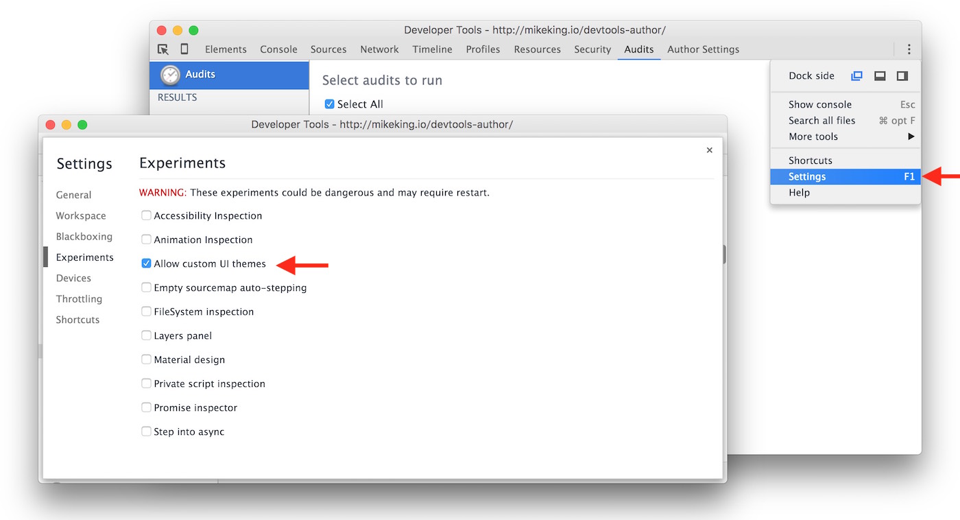 次に Chromeのデベロッパーツール[Cmd + Opt + I]を起動して、[Settings] > [Experiments]へ移動して「Allow custom UI Themes」にチェックを入れます。