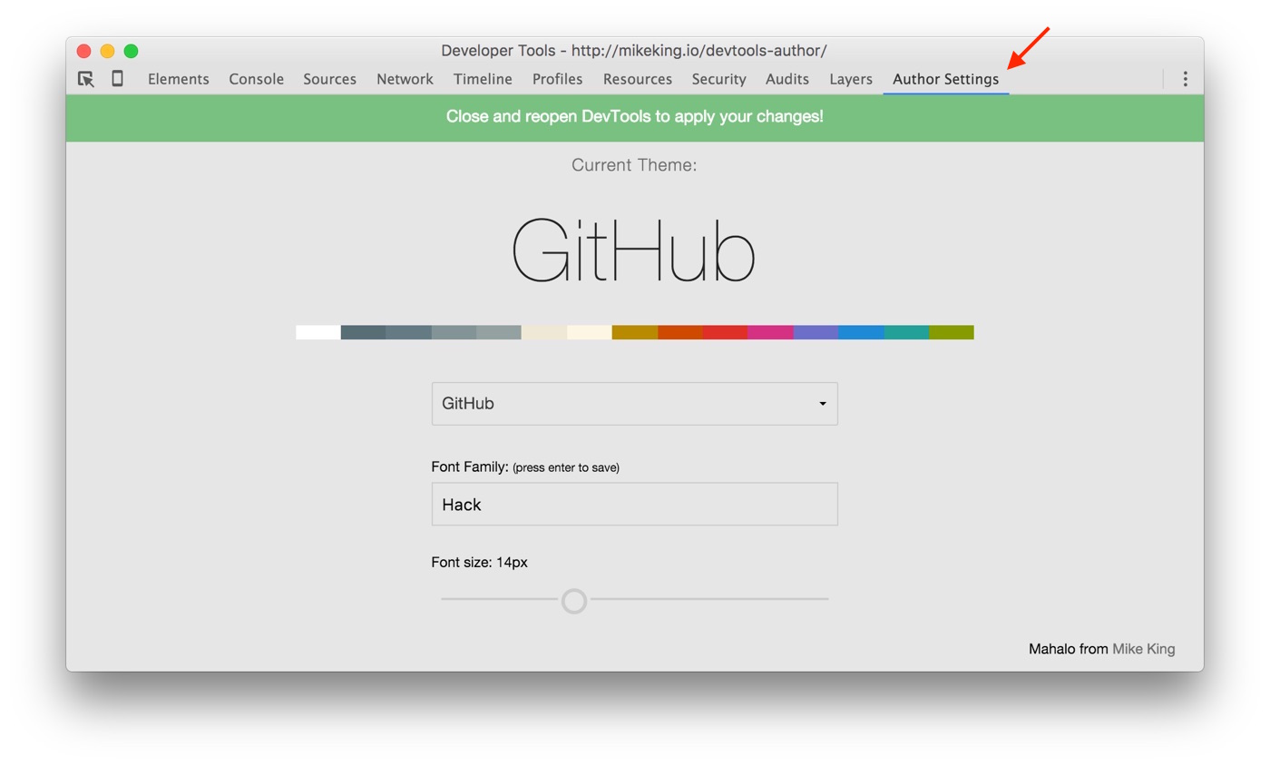 DevTools AuthorはハワイのデザイナーMike Kingさんが公開したGoogle Chrome用の拡張機能で、Chromeのデベロッパーツールのエディタのカラーやフォントを簡単に変更することが出来ます。