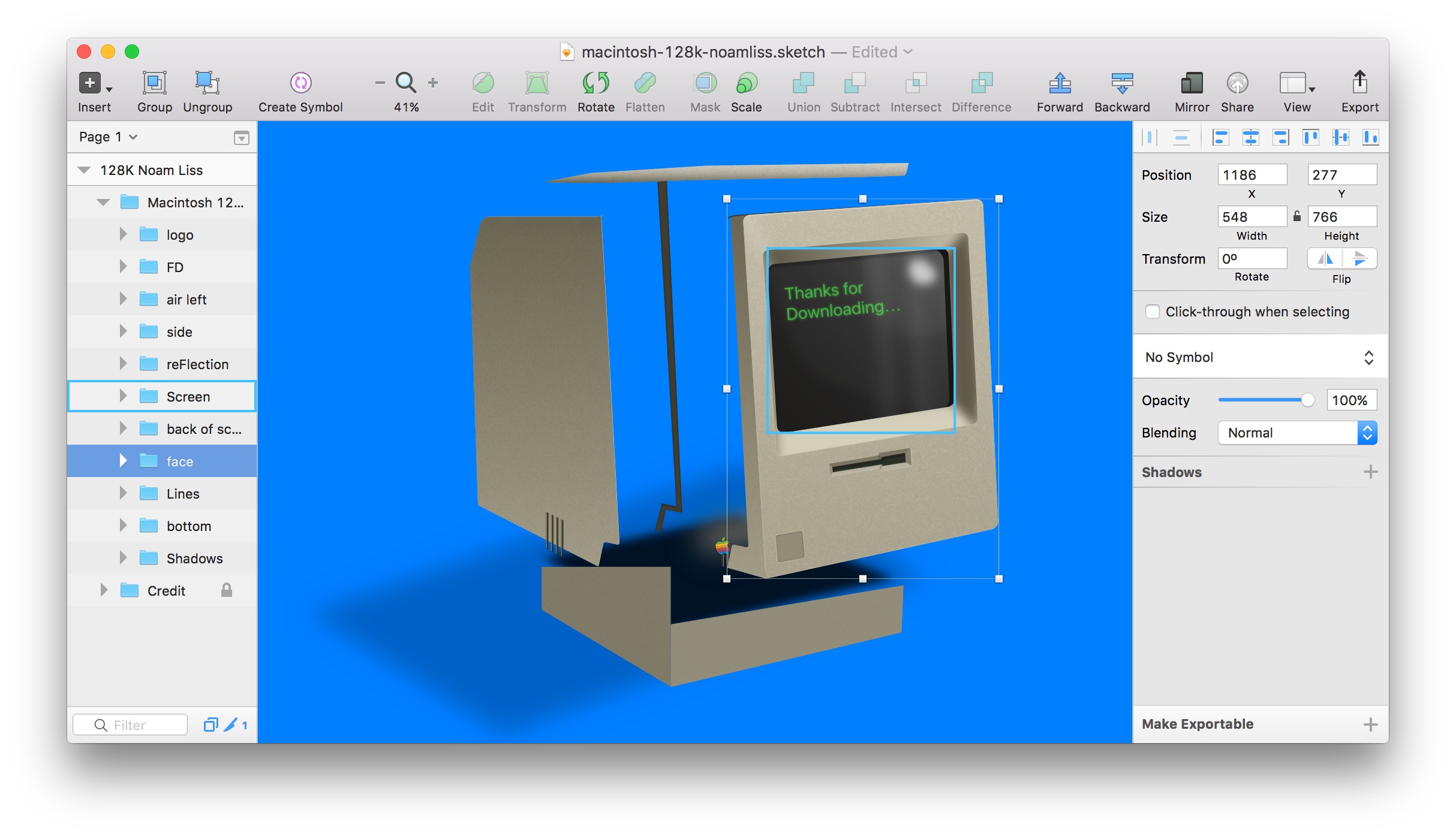 Macintosh 128KのSketch用素材を公開したのはSimilarWebのシニアプロダクトデザイナーのNoam Lissさんで、Macintoshのロゴ、フロッピーディスクドライブ、スクリーン、筐体など細かくレイヤー化されています。