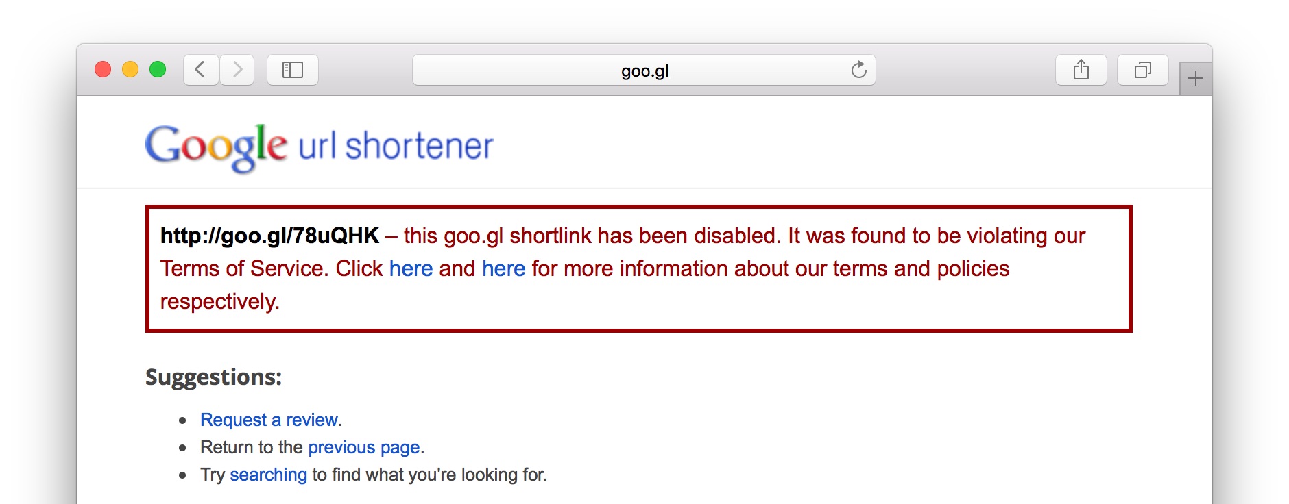 先月末、Uberのエンジニアが冗談で作成したSafariの不具合を利用しiPhoneやiPadをクラッシュ、Macをメモリ/ディスク不足へ追い込むサイト「CrashSafari」がTwitterなどのSNSで拡散され話題[1, 2]になりましたが、F-SecureによるとGoogleはこのCrashSafariのショートリンク規約違反とし無効化したそうです。
