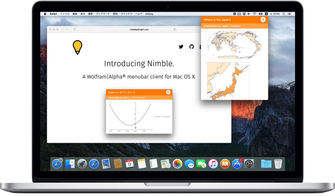 Mathematicaで有名なWolframの「Wolfram|Alpha」の機能をMacのメニューバーから利用できるユーティリティアプリ「Nimble」がリリースされています。詳細は以下から。