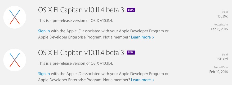 - 2016年02月10日:OS X El Capitan 10.11.4 Beta 3 (15E39d)