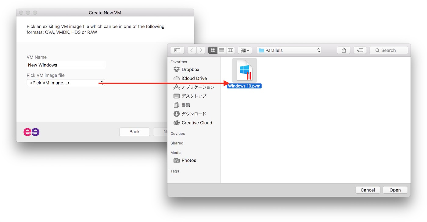 次にインポートするVMの名前を決め、[Pick VM image file]から既存のVMイメージファイルを選択します。今回はParallels Desktop 11 for Macで作成したWindows 10のイメージファイルをインポートしています。