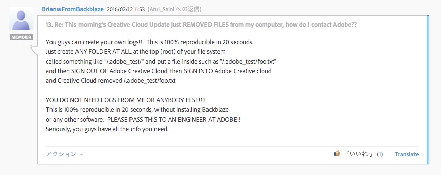 昨日リリースされたAdobe CC v3.5.0.206が原因で、Macのルートディレクトリにある不可視フォルダの一部が削除されてしまう不具合が問題[1, 2]になっていますが、この不具合はAdobe CCアプリのログアウト/ログインでも発生してしまうそうです。