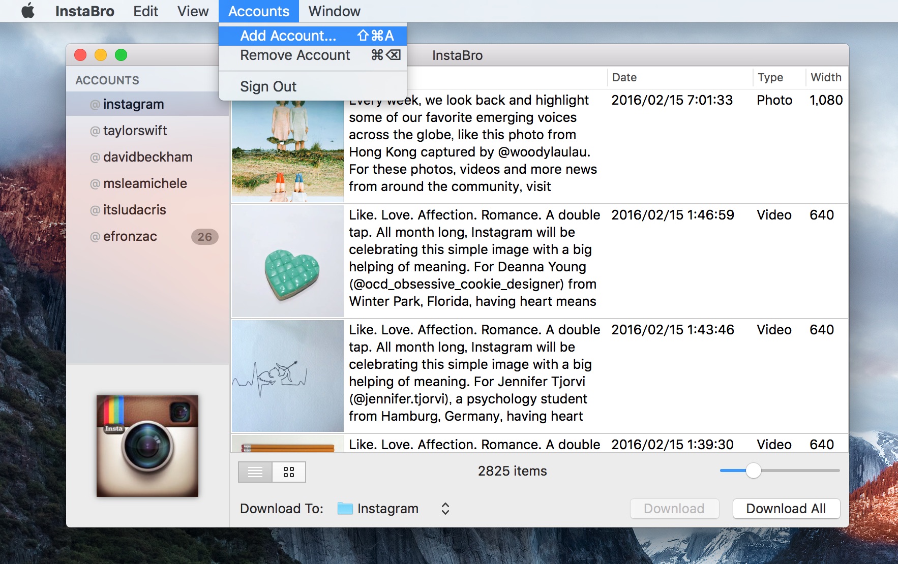 マルチアカウントの管理にも対応しており、メニューの[Accounts]からアカウントを追加することで、そのアカウントで公開されている画像や動画のサムネイル表示やQuickLook、キャプションやアップロード日時、画像のサイズ(リストビューを使用)などを見ることが出来ます。