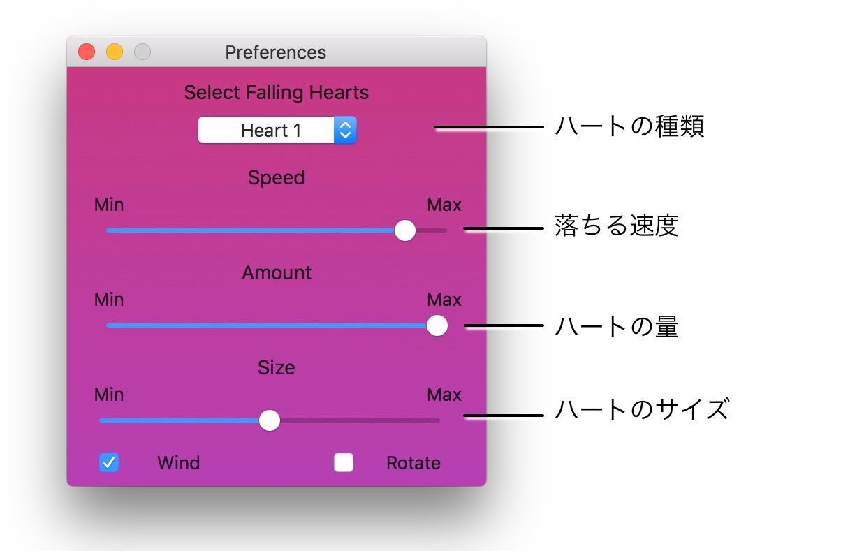 Falling HeartsはGremlins SoftのVegh Robertさんが開発&公開しているアプリで、Macのデスクトップ上に20種類のハートマークを降らせることが出来ます。