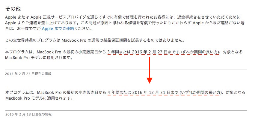 MacRumorsなどによると、Appleは現地時間2月18日、昨年2月に発表した「MacBook Pro ビデオの問題に対するリペアエクステンションプログラム」を「(2015年2月20日から)3 年間または 2016 年 2 月 27 日まで」から「4 年間または 2016 年 12 月 31 日まで」へ延長したそうです。